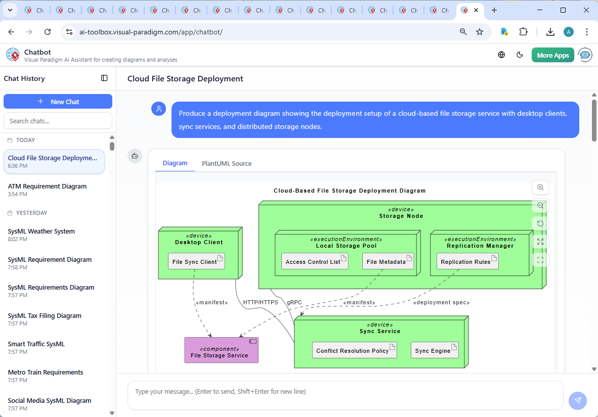 Enter the Visual Paradigm AI Chatbot—not just a diagram generator, but a collaborative modeling expert. By engaging in a natural conversation, users can evolve their ideas into detailed, standards-compliant diagrams with minimal effort. This article walks through the creation of a Deployment Diagram for a cloud-based file storage system, illustrating how the AI Chatbot functions as a design partner throughout the process.