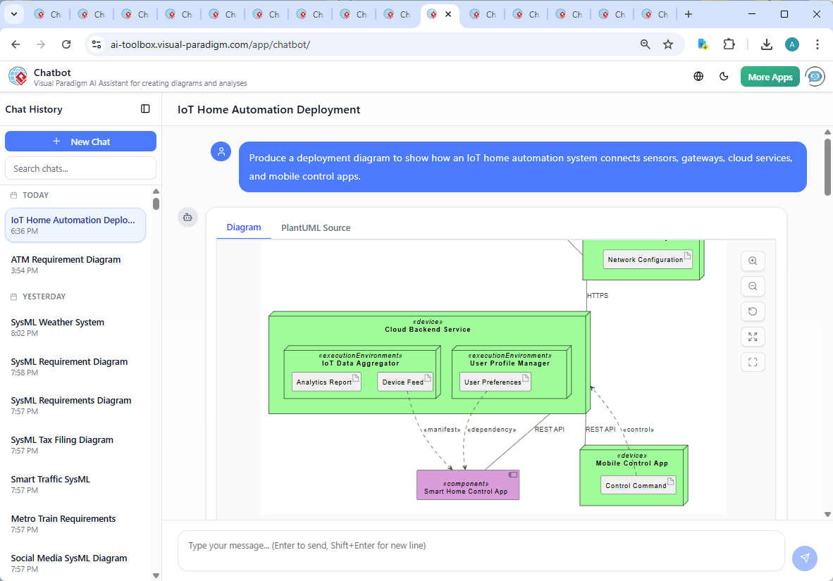 Within seconds, the Visual Paradigm AI Chatbot delivered a fully rendered PlantUML-compatible deployment diagram — complete with nodes, components, artifacts, and precise protocol annotations. The initial output wasn’t just a visual; it was a structured, semantically rich model grounded in real-world IoT architecture.
