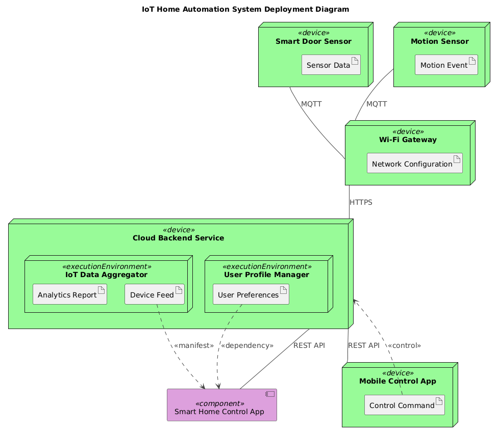 Two key devices — the Smart Door Sensor and Motion Sensor — are modeled as <<device>> nodes. Each generates an event (e.g., door state change or motion detection) and publishes it via MQTT to a topic on the Wi-Fi Gateway.
