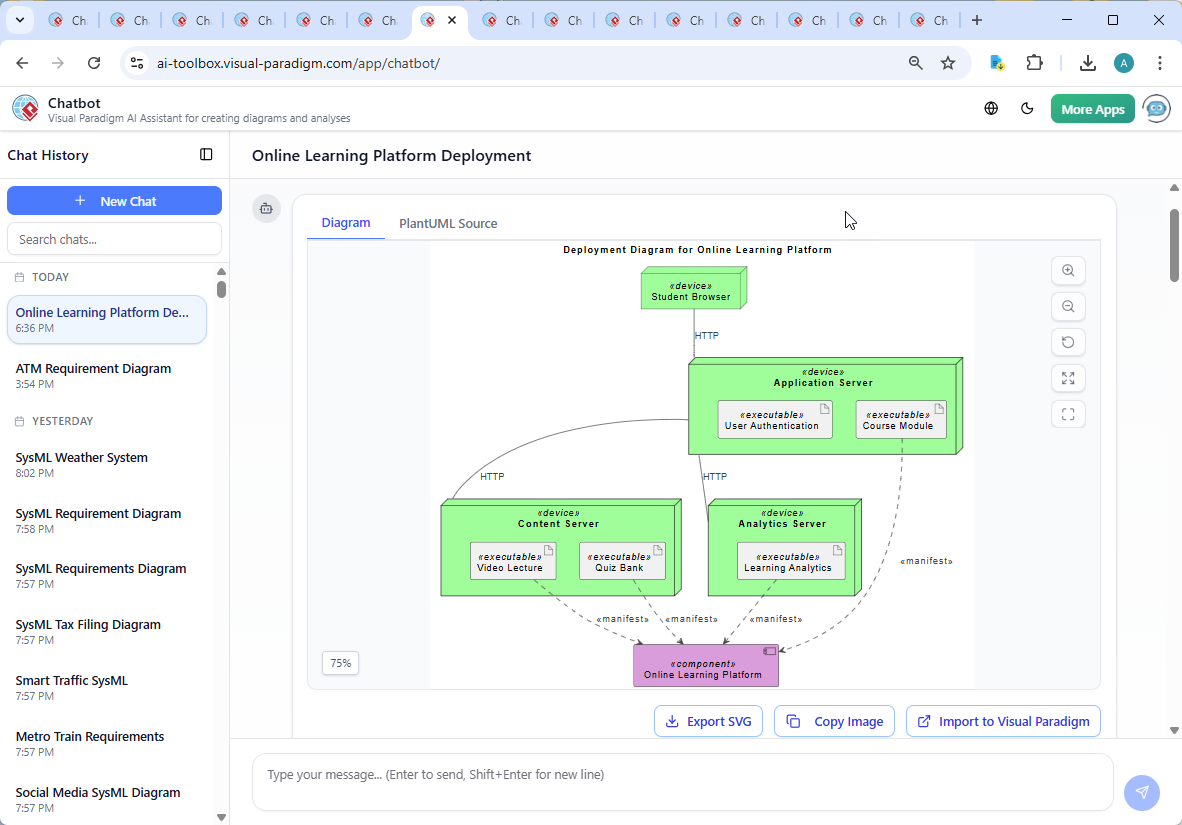 Within seconds, the Visual Paradigm AI Chatbot delivered a fully rendered PlantUML-based deployment diagram—complete with nodes, components, and communication paths. But the real value emerged in the conversation that followed.
