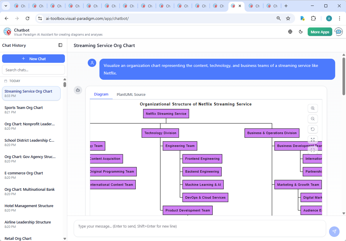 The organization chart for a global streaming service isn’t just a static hierarchy—it’s a living model of how teams interact, innovate, and scale. With the Visual Paradigm AI Chatbot, you don’t just create diagrams; you co-create strategic designs through natural conversation.