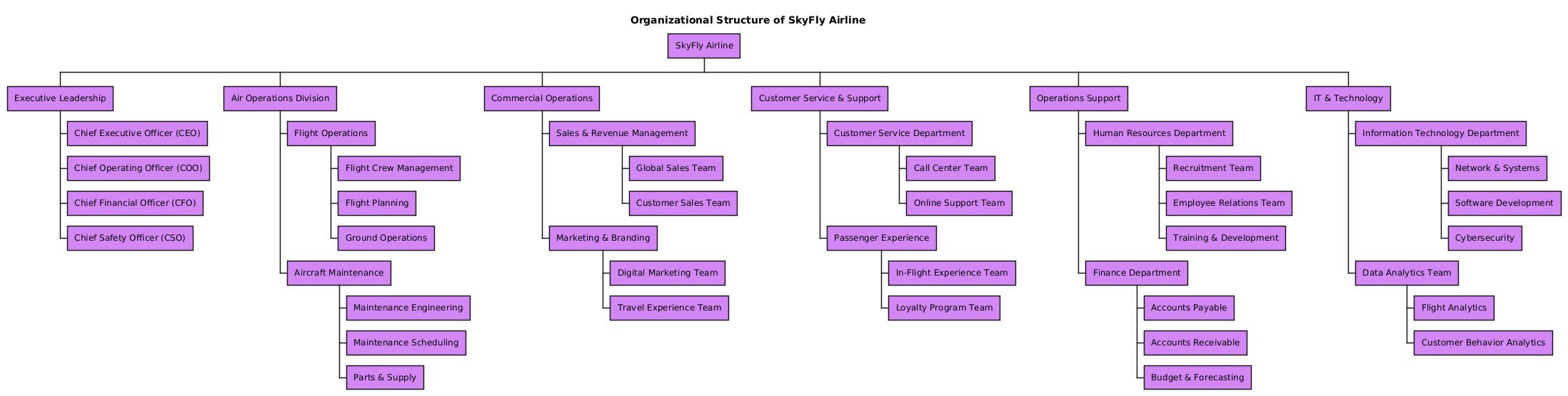 The resulting organization chart is built on a clear, multi-tiered hierarchy that reflects real-world airline operations: