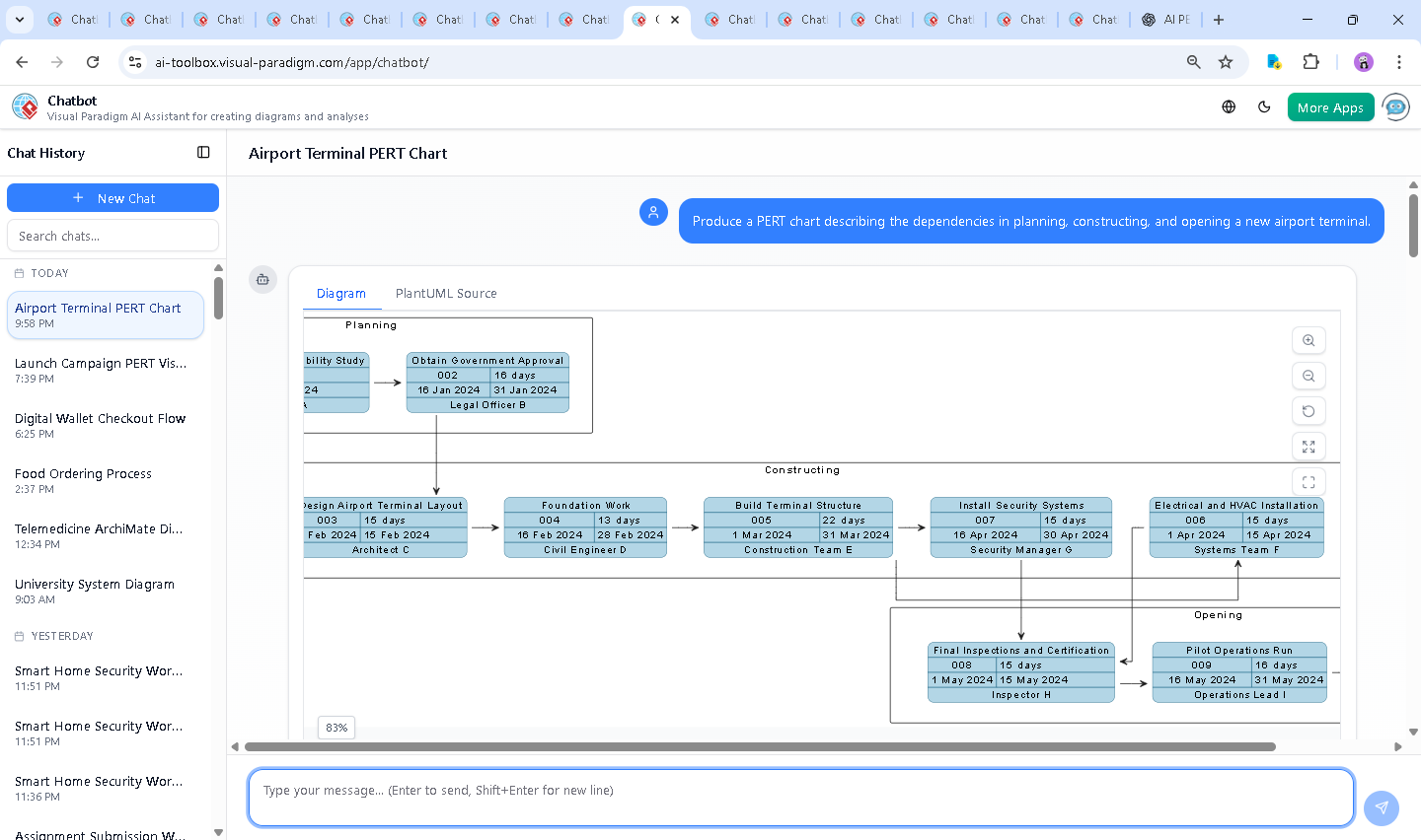 Creating a PERT chart for an airport terminal isn’t just about drawing boxes and arrows. It’s about understanding dependencies, managing risk, and aligning teams across disciplines. With Visual Paradigm’s AI Chatbot, that process becomes a dialogue—not a chore.