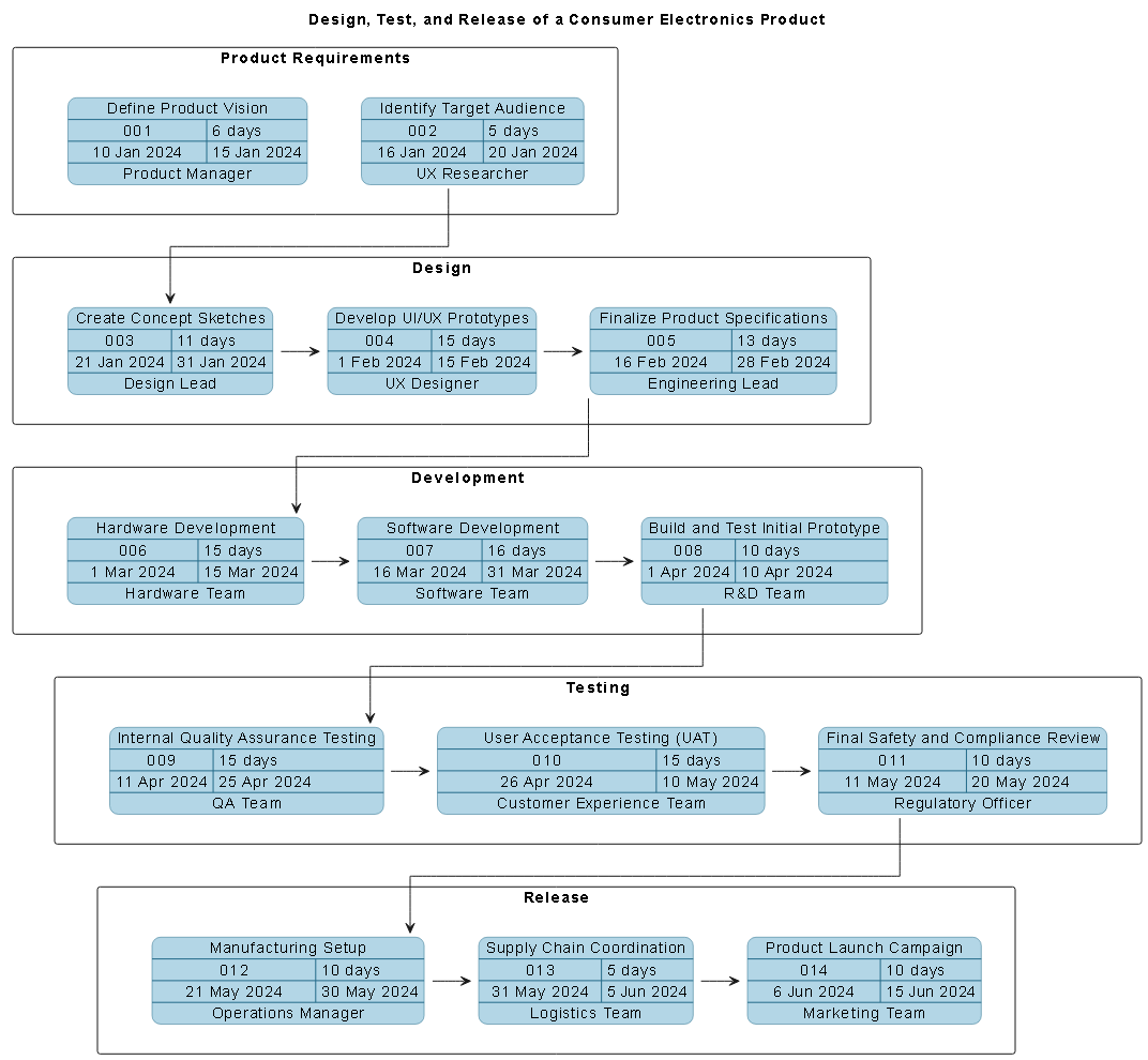 - Sequential Dependencies: Each task only starts after its predecessor finishes. For example, Hardware Development (task06) can’t begin until Finalize Product Specifications (task05) is complete.
