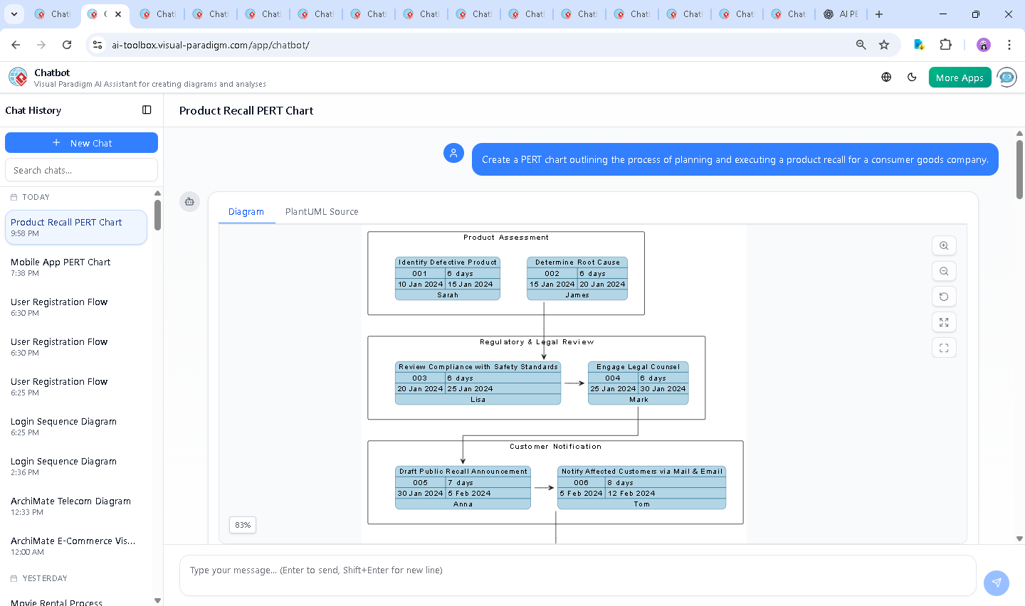 It began with a simple instruction: “Create a PERT chart outlining the process of planning and executing a product recall for a consumer goods company.” The AI Chatbot didn’t just generate a diagram—it interpreted the intent, mapped out a logical workflow, and structured it across five key lanes: Product Assessment, Regulatory & Legal Review, Customer Notification, Product Removal & Recall Logistics, and Customer Support & Compensation.