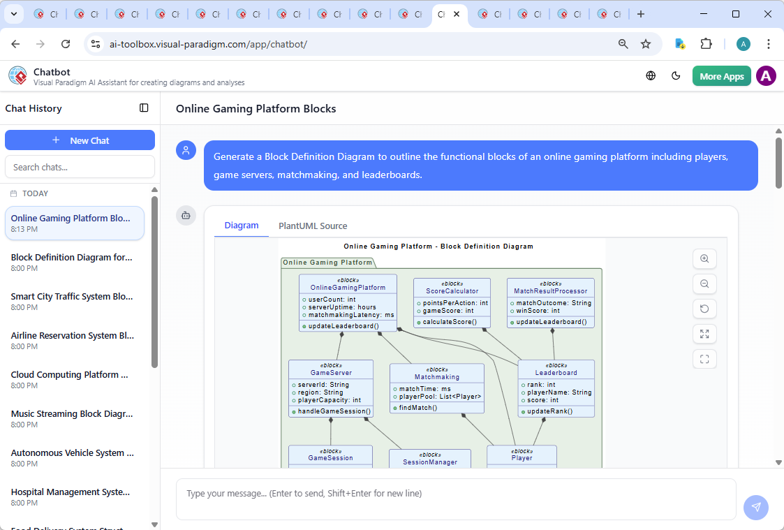 The journey began with a simple request: “Generate a Block Definition Diagram to outline the functional blocks of an online gaming platform including players, game servers, matchmaking, and leaderboards.” Within seconds, the AI Chatbot responded with a fully rendered PlantUML code snippet, structured as a SysML Block Definition Diagram.