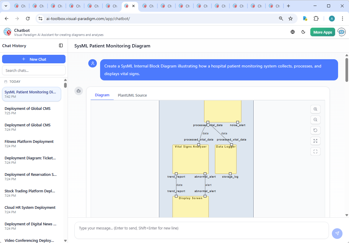 Enter the Visual Paradigm AI Chatbot, your collaborative modeling partner. Instead of starting from scratch or wrestling with syntax, you simply describe your intent: “Create a SysML Internal Block Diagram illustrating how a hospital patient monitoring system collects, processes, and displays vital signs.” Within seconds, the AI generates a precise, production-ready IBD—crafted using the Visual Paradigm AI Chatbot and grounded in SysML standards.