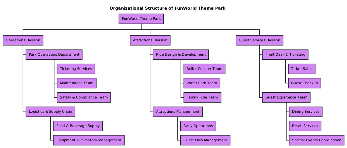 PlantUML’s @startwbs syntax was chosen for its clarity in hierarchical modeling. The use of nested asterisks (e.g., ** Operations Division) visually enforces the parent-child relationship, making it easy to scan and understand. The style block with a soft purple background enhances readability and aligns with FunWorld’s brand identity—subtle but intentional.