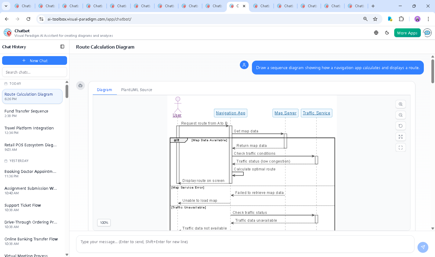Creating a high-fidelity sequence diagram for a navigation app’s route calculation isn’t just about drawing lines—it’s about capturing the complexity, uncertainty, and intelligence behind real-world software systems. With Visual Paradigm’s AI Chatbot, that process becomes interactive, intelligent, and deeply collaborative.