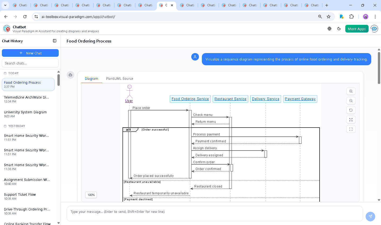 The journey began with a simple request: “Visualize a sequence diagram representing the process of online food ordering and delivery tracking.” Within seconds, the AI Chatbot generated a fully rendered UML Sequence Diagram, complete with lifelines, activation bars, and conditional logic—all in a clean, readable format.