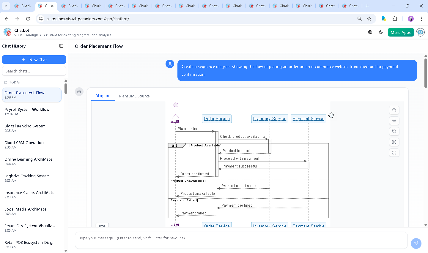 Designing a reliable order placement process for an e-commerce platform requires precision in capturing system interactions—especially around inventory checks and payment validation. Traditional diagramming tools demand manual layout, precise syntax, and deep modeling knowledge. But with the Visual Paradigm AI Chatbot, this becomes a conversational journey, not a technical chore.