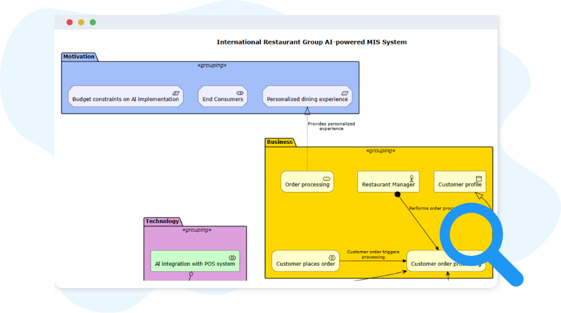 Enterprise architectures often evolve as new insights emerge. With conversational refinement, you can adjust your model instantly—add missing application components, update business processes, introduce infrastructure nodes, or generate specific viewpoints for different teams. This interactive approach helps you explore alternatives, validate alignment across layers, and maintain a living architectural picture that adapts as the organization grows.