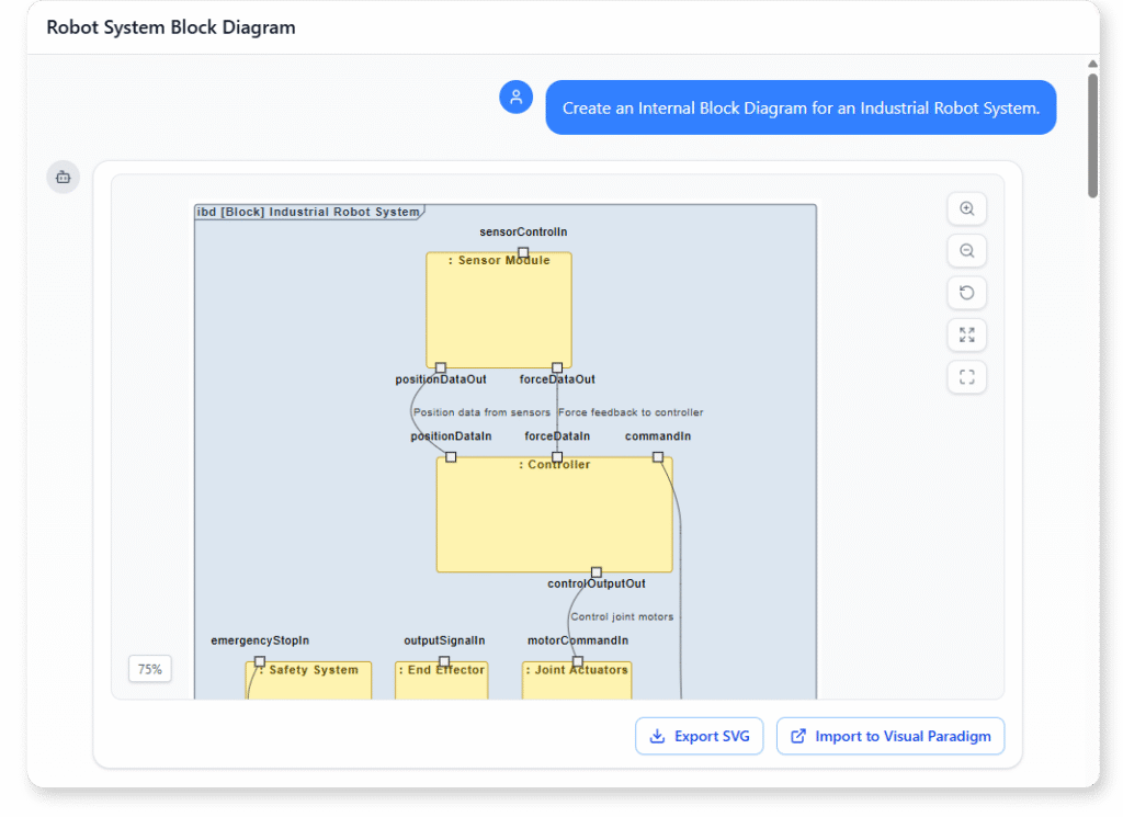 You can generate a detailed Internal Block Diagram instantly by describing how the parts of a system interact within a block. The AI interprets your explanation, identifies the internal components, and arranges their ports and connections in a structured SysML layout. This gives you a ready-to-use internal design model without the manual effort of drawing each connector yourself.