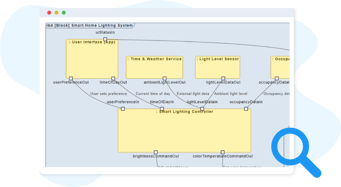 Continue shaping your internal design by simply asking for adjustments. You can introduce new ports, add missing parts, restructure connections, or test alternative internal layouts through natural dialogue. Whether you are mapping signal routes or refining interface points, the AI updates the diagram in real time, helping you clarify your internal interactions step by step.