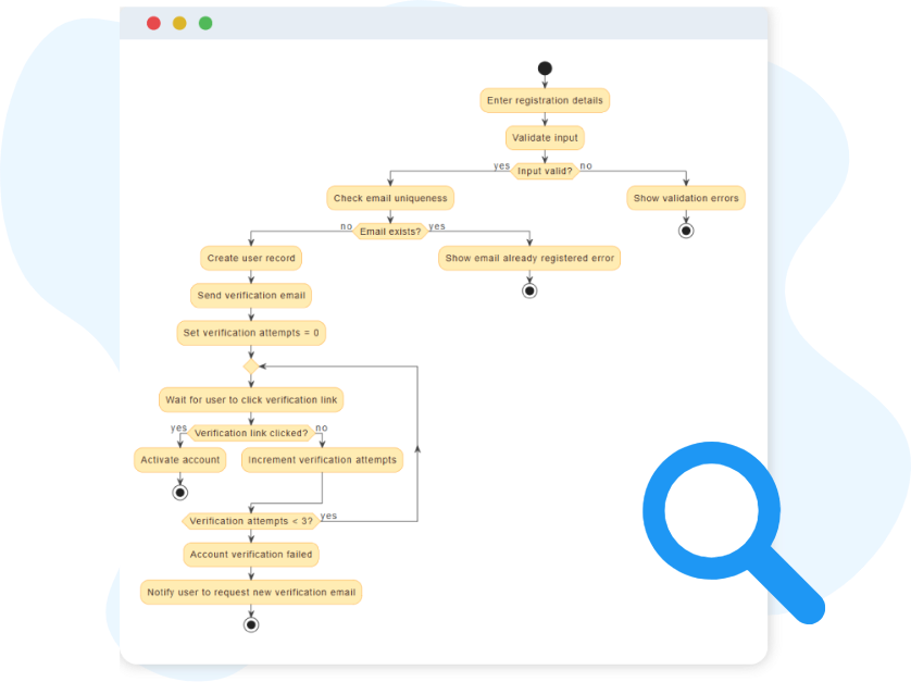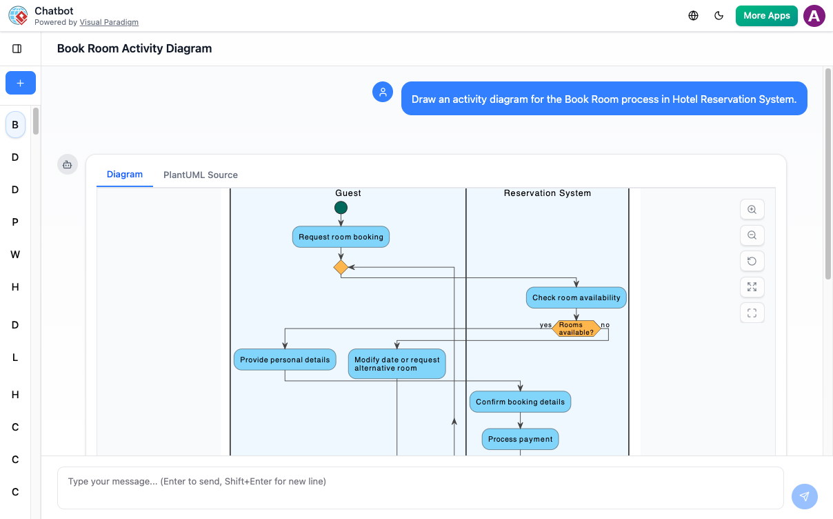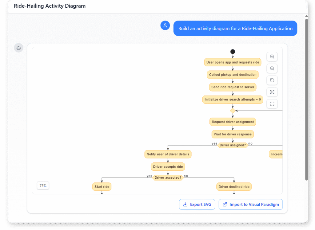Instead of spending time laying out shapes and arrows by hand, you can describe your process in plain language and let the AI turn it into a complete Activity Diagram. Whether you outline a simple step-by-step flow or a complex route with decisions and parallel paths, the chatbot converts your text into a clean, structured workflow in seconds. This makes it easy to start visualizing ideas immediately without worrying about notation or formatting.
